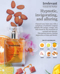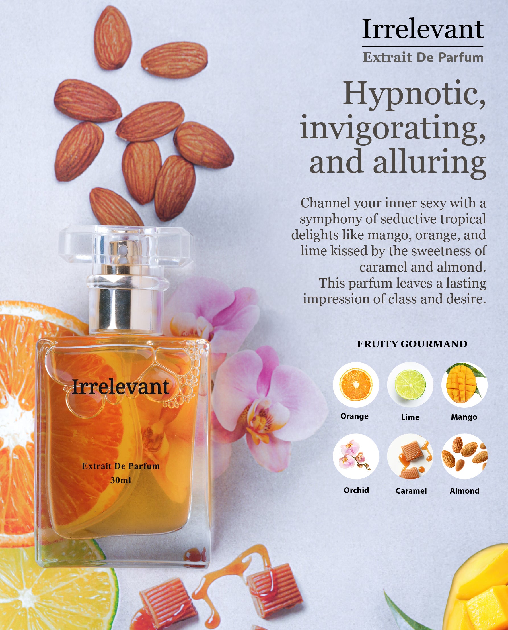 Irrelevant is a tribute to the Bahamian culture. This unisex parfum awakens your senses with sun kissed bursts of sweetened caramel, lime, mango, patchouli, and orange. Your small Caribbean vacation in a bottle.